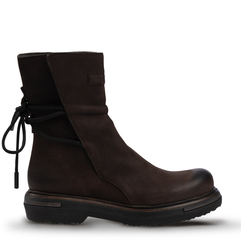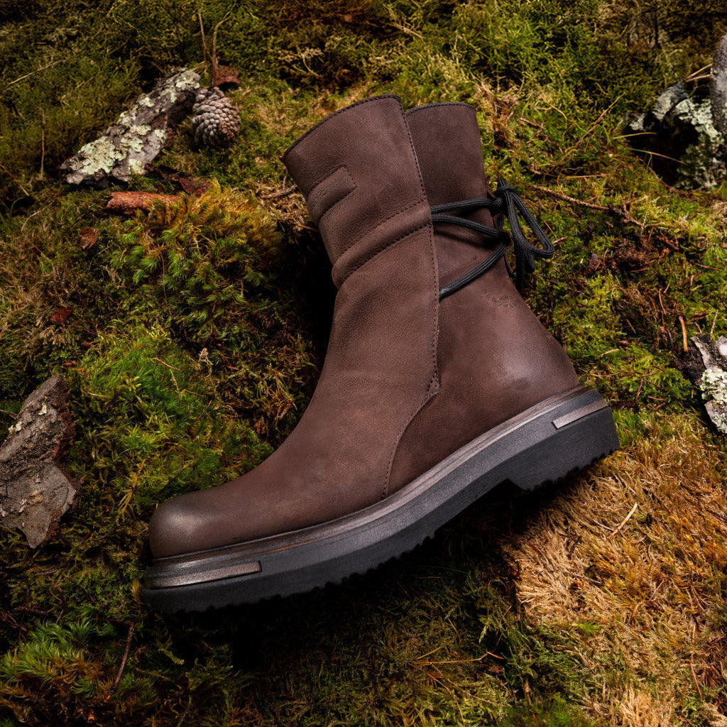 Tronchetto in pelle con aperture laterali con suola in gomma forma arrotondata con inserti e bordo in cuoio grezzo e tacco ergonomico molto moderno. Battistrada effetto crepe con logo personalizzato. Altezza tacco 40 mm altezza suola 25 mm platform 15 mm.
