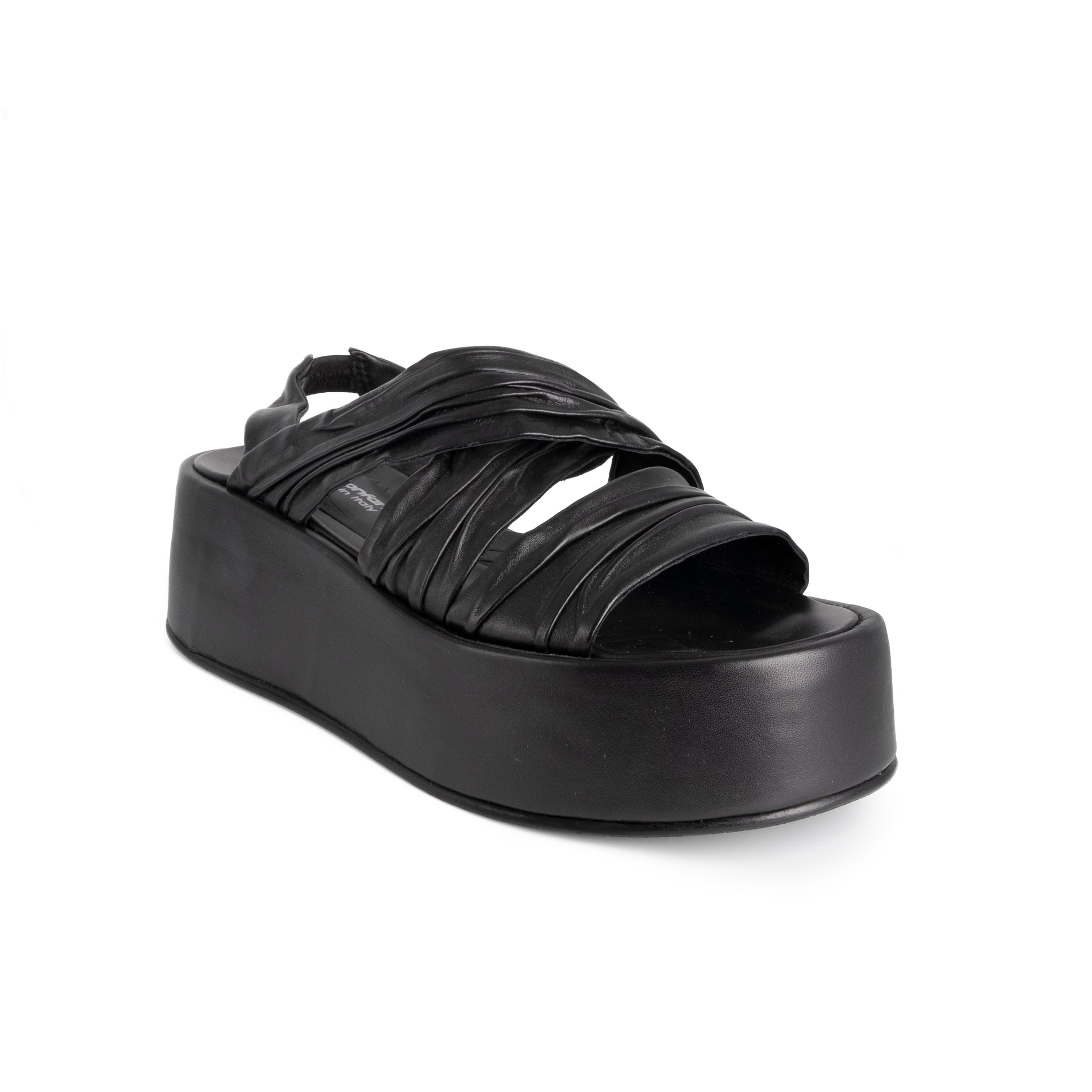 The upper features dynamically designed crisscrossing straps that wrap around the foot in a visually striking draped effect while ensuring stability and comfort. The structure is completed by the Maya New Black wedge, a bold yet lightweight platform that slims the silhouette while maintaining excellent everyday wearability.