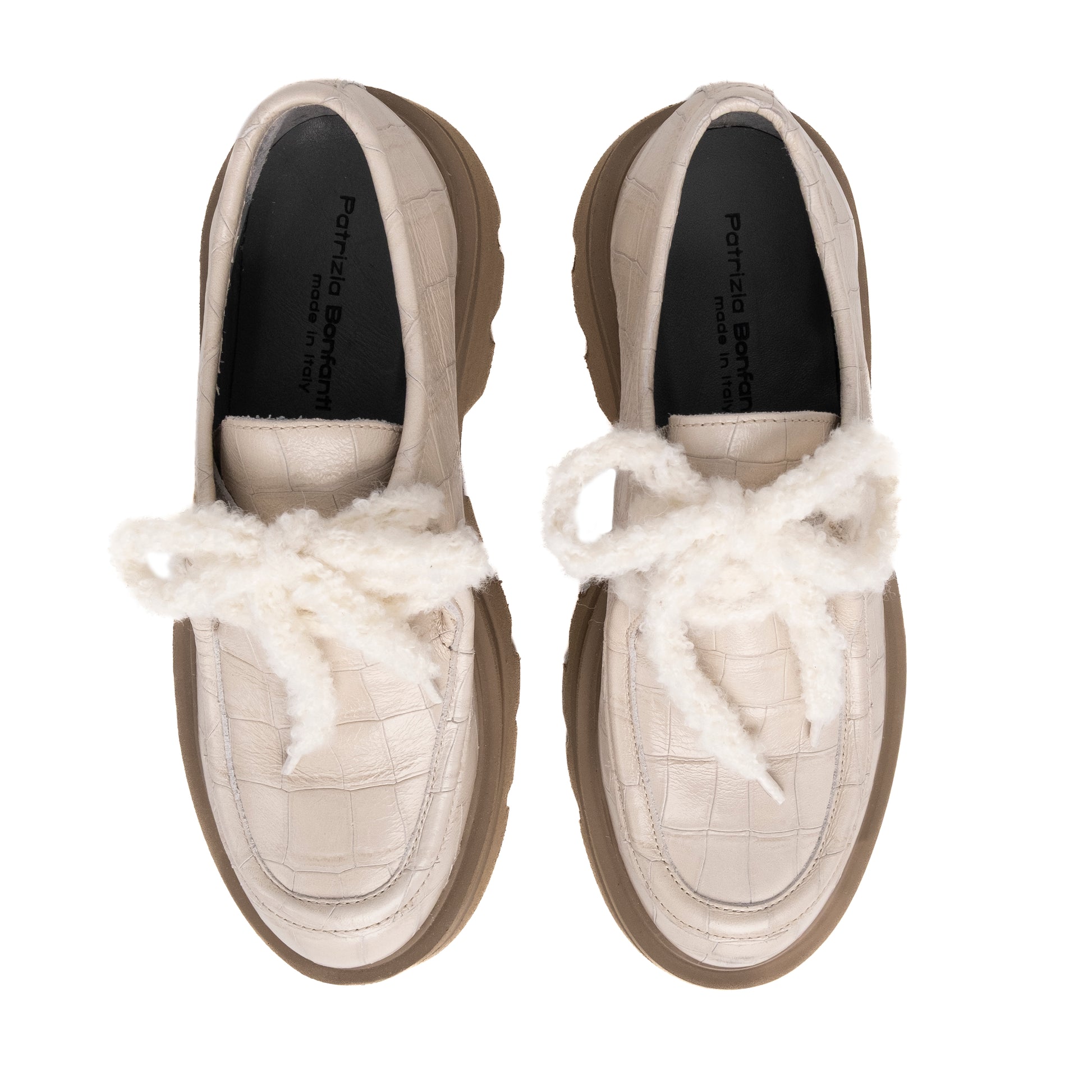 Flat shoe in leather, round toe, cotton lace, leather inside, noriko sole in notched rubber, heel height 45mm, platform 25mm, cushion 15mm