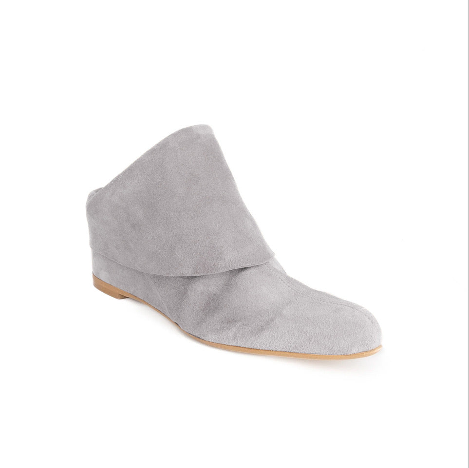 A perfect balance between contemporary design and tailored comfort. This ankle boot is crafted from soft grey suede, shaped to naturally wrap the foot and create subtle folds that enhance the material’s texture, making each pair unique.